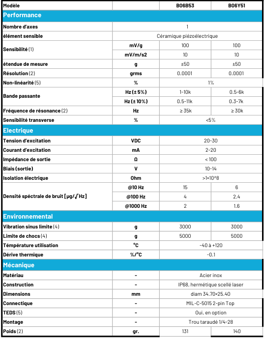 Les capteurs B06B53-B06Y71 sont des accéléromètres destinés aux applications industrielles : ils disposent d’un connecteur 2-pin MIL-C-5015 et d’un boîtier durci (140 grammes en acier inox). Les dimensions sont de diamètre 34.70×25.40 mm La sensibilité est de 100 mV/g pour une gamme de ±50g La différence entre les deux modèles se situe au niveau de la bande passante (+/-5%) : 1-10k Hz pour le B06B53 et 0.5-6k Hz pour le B06Y51.
