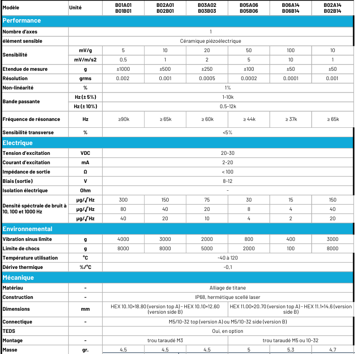 Les capteurs de la gamme B0xA14-B0xB14 sont des accéléromètres monoaxes piézoélectriques (IEPE) à usage généraux.