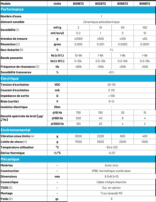 Les capteurs de la gamme B0xB72 sont des accéléromètres monoaxes piézoélectriques (IEPE) waterproof. Le boîtier et câble intégré étanche sont conçus pour résister à une pression allant jusqu'à 2 MPa. Disponibles en 4 étendues de mesure (±2500 ; ±500 ; ±100 ; ±50g).