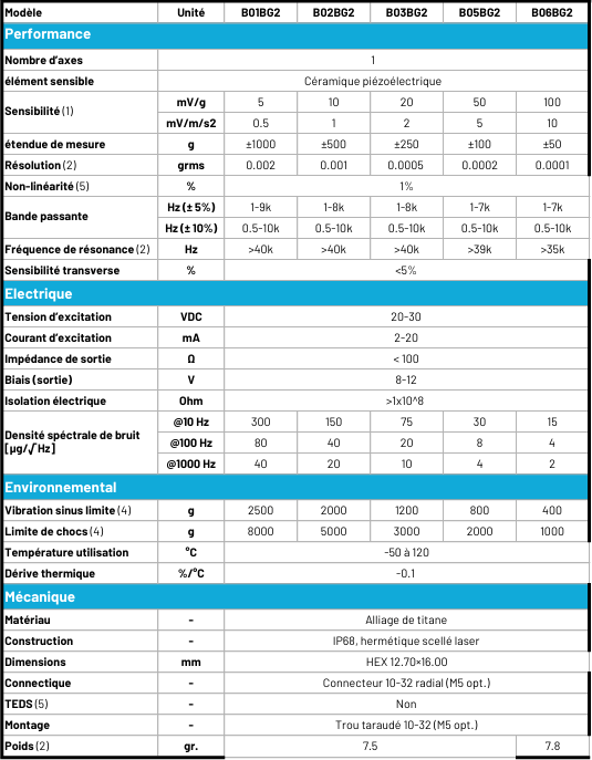 Les capteurs de la gamme B0xBG2 sont des accéléromètres monoaxes piézoélectriques (IEPE). Disponibles en 5 étendues de mesure (±1000 ; ±500 ; ±250 ; ±100 ; ±50g). Ces capteurs disposent d’une base isolée électriquement. La masse de l’accéléromètre est de 7.5 grammes, le connecteur est un 10-32 radial (M5 en option) et le montage se fait via un trou taraudé 10-32 (M5 en option)