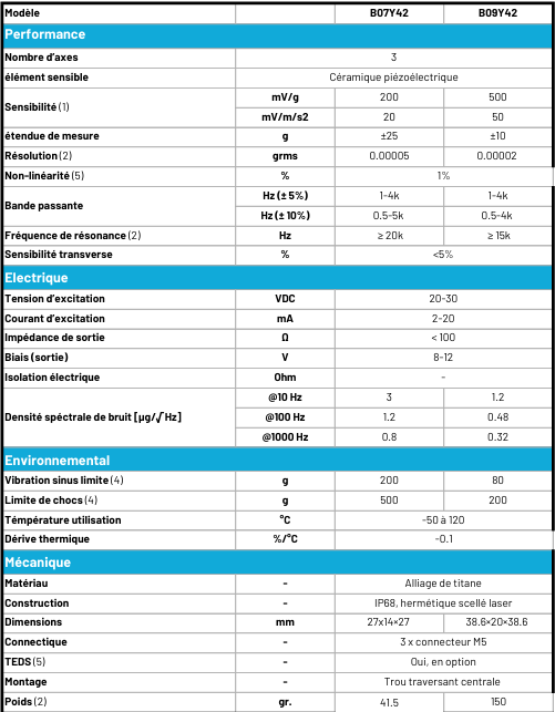 Les capteurs de la gamme B0xY42 sont des accéléromètres triaxes piézoélectriques (IEPE),