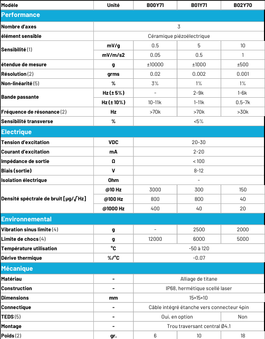 Les capteurs de la gamme B0xY71 sont des accéléromètres triaxes piézoélectriques (IEPE) waterproof. Le boîtier et câble intégré étanche sont conçus pour résister à une pression allant jusqu'à 2 MPa. Disponibles en 3 étendues de mesure (±10000 ; ±1000 ; ±500g).