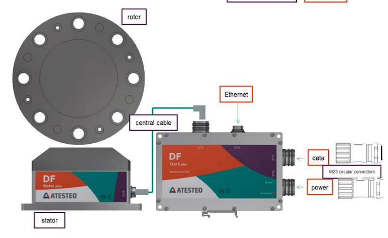 Le système se distingue par sa modularité : les versions DF1 à DF5 plus couvrent des plages de 100 Nm à 10 kNm. Les interfaces de sortie incluent des signaux fréquence (RS422), analogiques (±10 V), CAN 2.0B (2 kHz) et Ethernet, compatibles avec la plupart des systèmes d’acquisition industriels. La configuration s’effectue via une interface web moderne (logiciel TCU Discover fourni), permettant un paramétrage rapide des seuils d’alarme, des filtres numériques et des protocoles de communication.