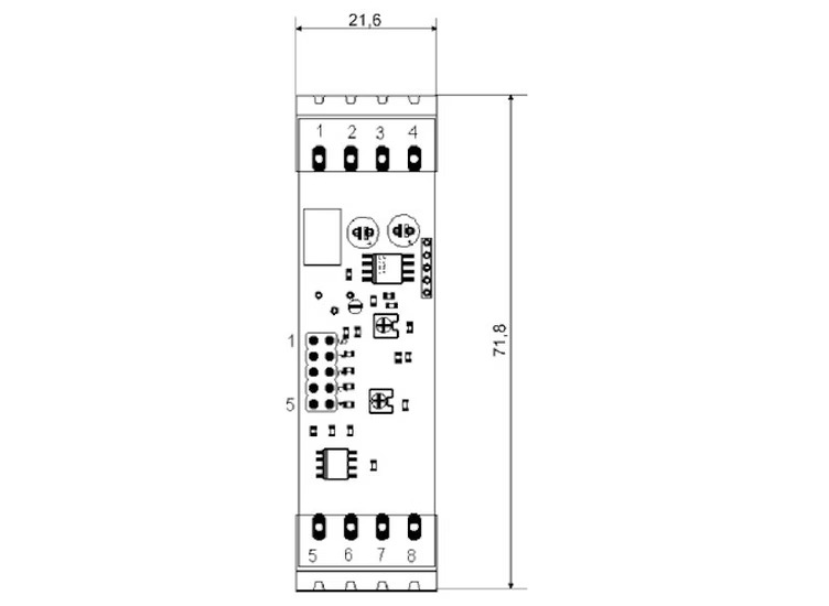 Le conditionneur est conçu pour une installation dans une armoire électrique. Montage sur Rail-DIN, connectique de type bornier à vis, plage de température étendue (-40/+85°C). Les bornes 5 à 8 sont réservées au capteur de force / couple, et permettent de raccorder jusqu'à 4 capteurs. L'alimentation (21-28 volts) est branchée sur les pins 5 et 8.