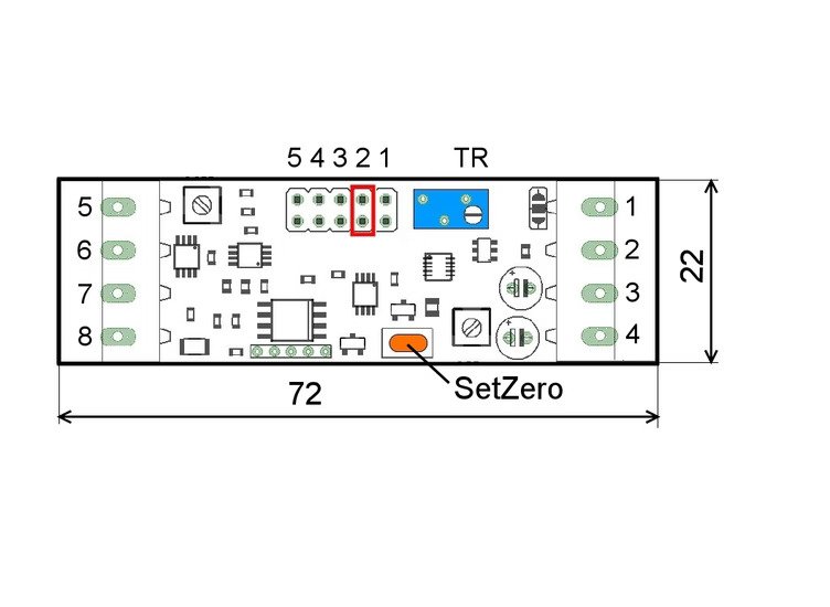 Le réglage de la sensibilité se fait par cavalier. En position 5, le réglage se fait via potentiomètre (TR).