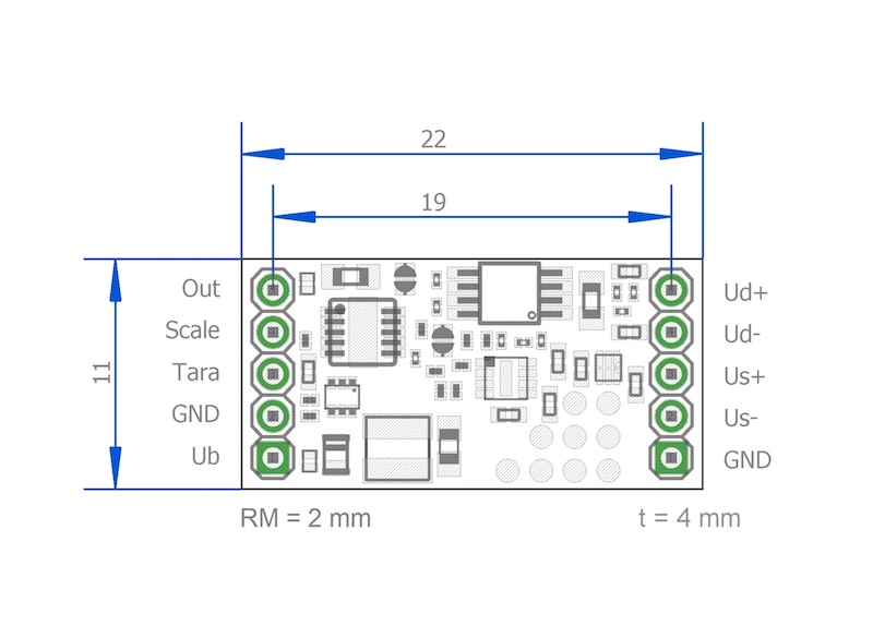 - sortie: 0-10V (offset 5V), 0-5V (offset 2.5V), 4-20mA (offset 12mA)