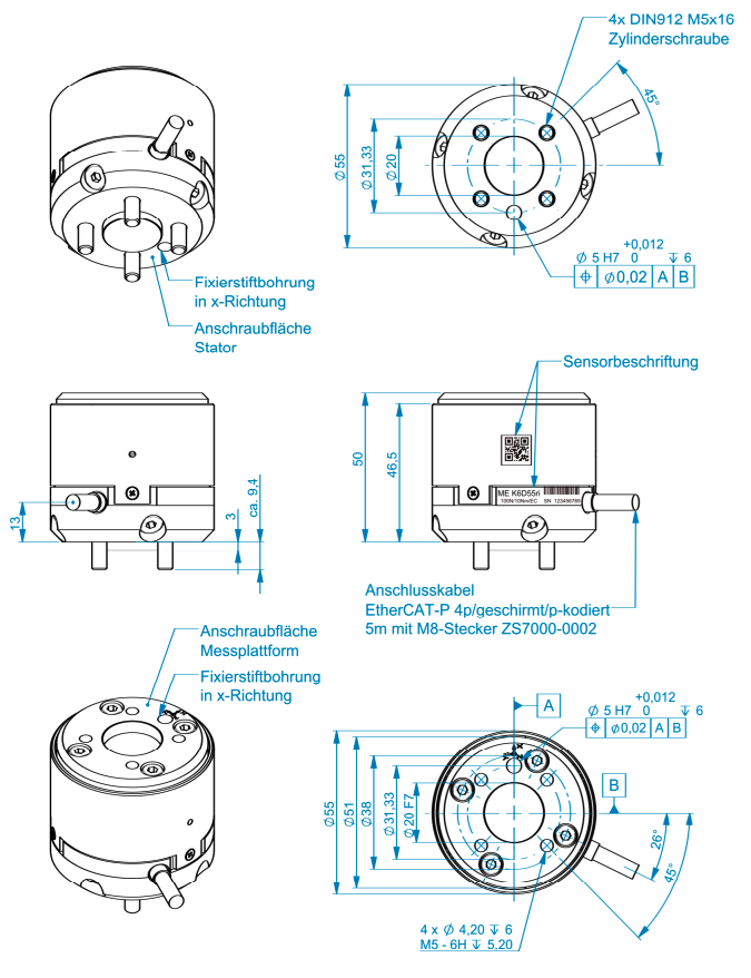 Le capteurs de force 6 composantes K6D55i se monte directement sur le bras d'un robot, entre le robot et l'outil, sans bride ou pièce d'adaptation supplémentaire. L'introduction des efforts et la fixation au bras du robot sont réalisées par 4 taraudages M5 + 2 pions de centrage Ø6 mm H7.