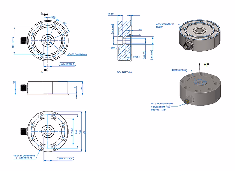 Le capteur se monte via son ouverture centrale, permettant une transmission uniforme de la force. Ses dimensions compactes (diamètre 71 mm) facilitent son insertion dans des montages existants avec espace limité. Les versions optionnelles incluent des protections adaptées aux environnements sévères (IP68, plage de température étendue, compatibilité vide ou pression).