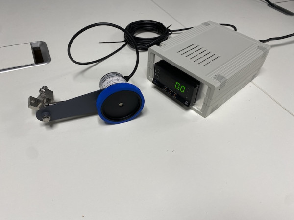 La roue codeuse est maintenue en contact permanent avec la bande. La rotation de la roue, proportionnelle à la vitesse réelle de la bande, est mesurée par le codeur. Le signal est :