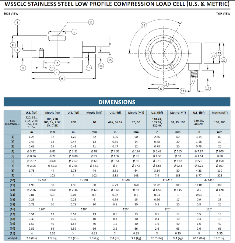 WSSCLC est un capteur de compression à bouton de charge compact et très précis conçu pour la mesurer de charges pouvant atteindre 200 tonnes avec une précision < 0,023%. Le capteur WSSCLC à jauge de contrainte est disponible en 15 étendues de mesure comprises entre 0-100kg et 0-200 tonnes, avec une sensibilité de 2,0 mV/V.